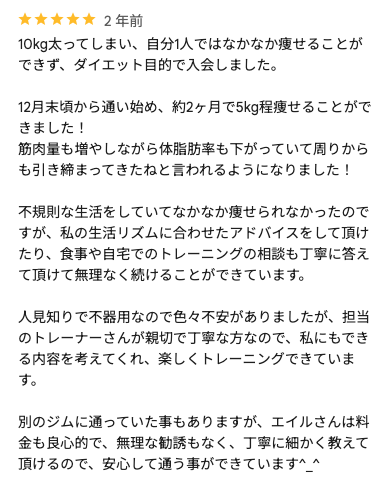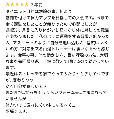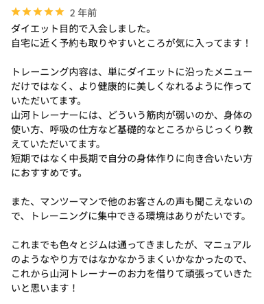 ボディメイク目的で週1回のペースで通っています。週1回でもちゃんと筋肉量が増えて、体脂肪率も下がっています。(+5kg/-6%)周りから良い体になったと言われるようになりました!パーソナルなので自分の体型・その日の体調に合わせて、トレーニングの内容をカスタマイズしてくれます。山河トレーナーのオリジナルトレーニングもあって飽きずに楽しめます。