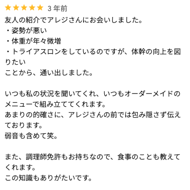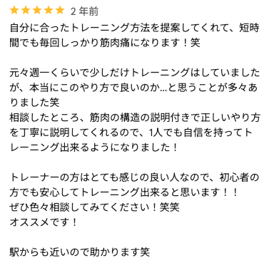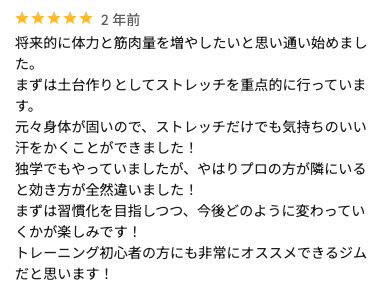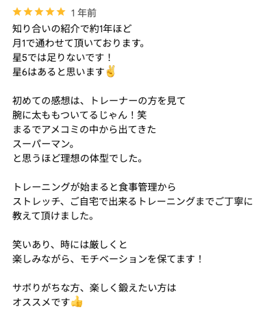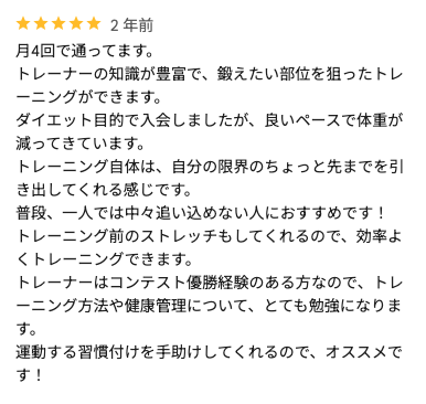 通い始めて半年ほどですが、明確に効果を感じています。私自身は24hジムでトレーニングもしておりますが、自分では気づかない欠点やクセを指摘してくださり、通う前よりも体が成長してきました。 ただ筋トレ方法を教えてくれるだけでなく、ストレッチや体の使い方などを丁寧に教えてくれるおかげで、自分自身のトレーニングの質も向上しました。大会での入賞目指して、引き続きご指導よろしくお願いいたします!