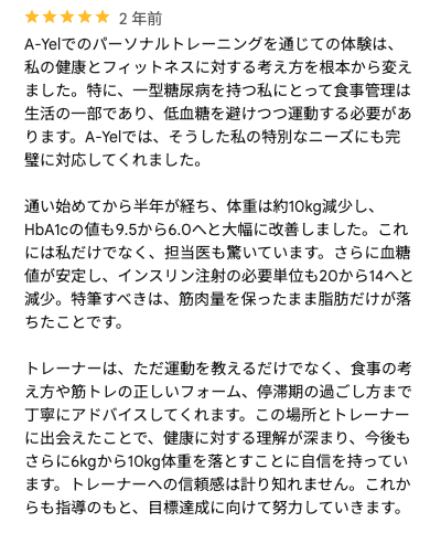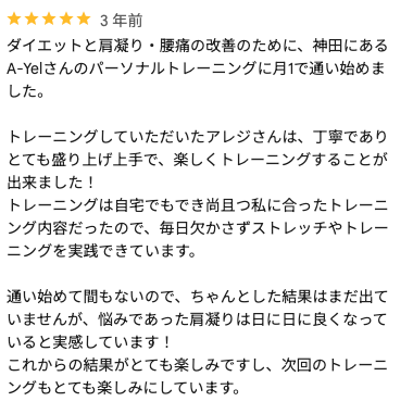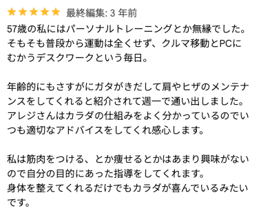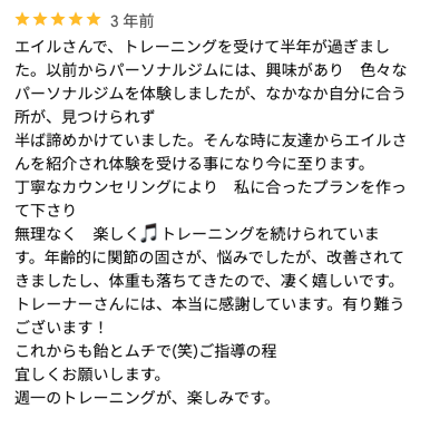 ダイエットと手術後の体力回復のために、50才すぎから通い始め約3年通っています。50才すぎてから通い始め82キロスタートで今約7キロ減量!少し身体が柔らかくなり、これから年をとるので老化防止のために通っています。先生いつもありがとうございます😆自堕落な自分を怒らず優しくご指導頂き、感謝です。現在ストレッチを中心に、股関節周りをほぐすことを行っています。引き続き頑張って、52キロ目指します笑😆まだまだ遠い〜😝